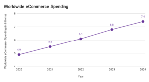 eCommerce spending will reach a huge $5.5 trillion dollars in 2022. This is a 12.2% increase from 2021, which had a worldwide eCommerce spending of $4.9 trillion dollars.