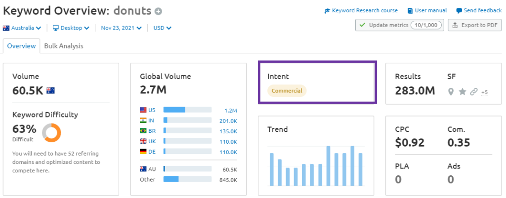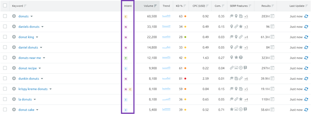 The average search intent for the keyword “donuts” is commercial, meaning that users want to learn more about donuts before purchasing one.